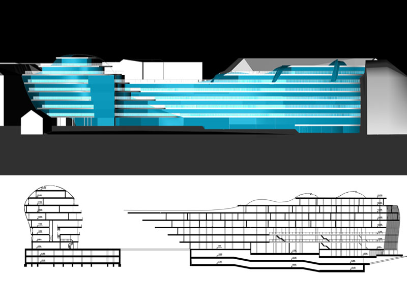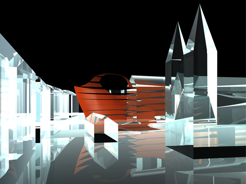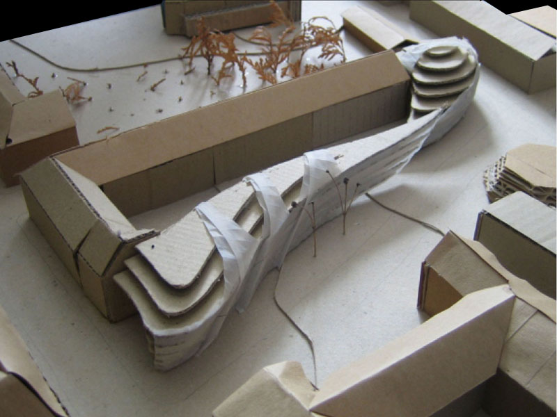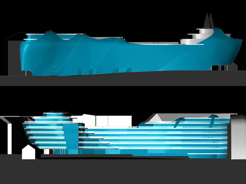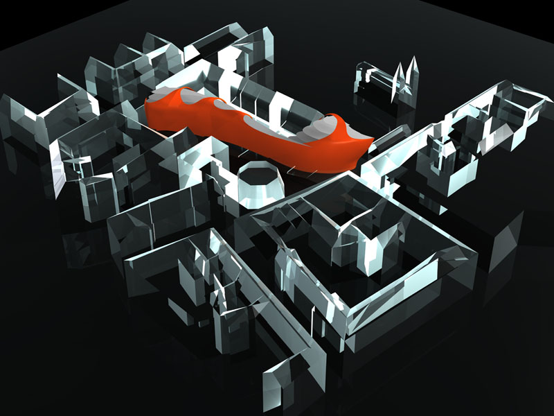 Organická struktura vyplňující proluku, která jako krunýř chrání vnitřní atrium od přilehlé rušné komunikace. Z jedné strany objekt uzavírá předsazený plast, aerodynamicky nastavný k převládajícím směrům větru, zajišťující přirozené větrání a cirkulaci. Z druhé, jižní strany, se objekt terasovitě otvírá a umožňuje přirozeně prosvětlit co nejvíce prostoru a vnitřních átrií. Funkčně samostatný objekt určený pro služby a kulturu se jako nálevka otvírá směrem k Andělu a pěší zóně.