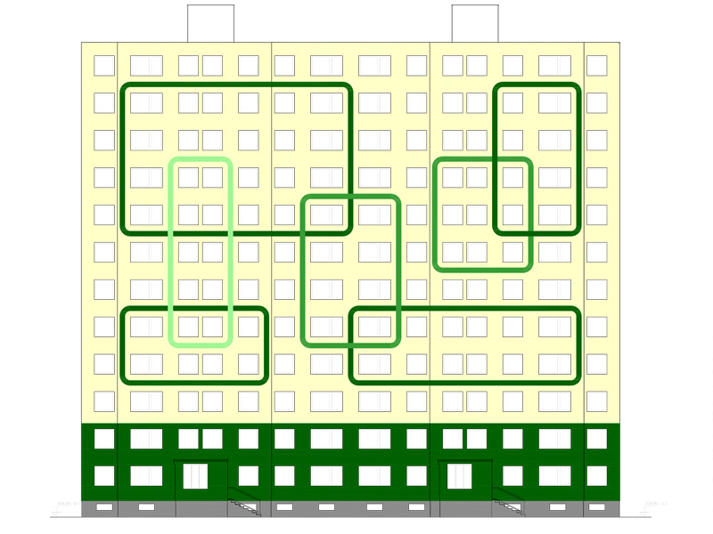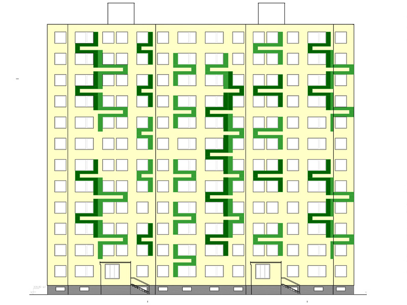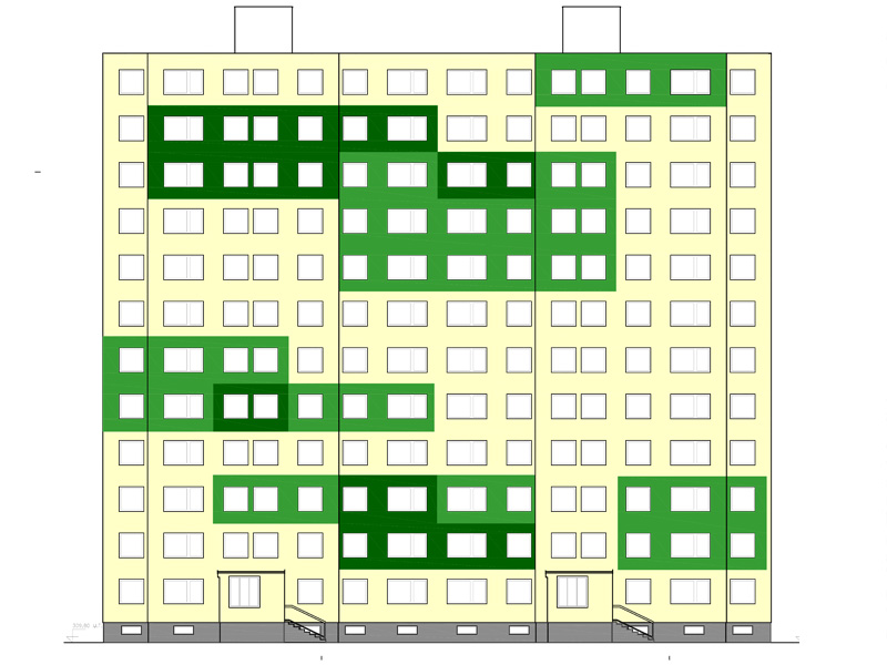 Rekonstrukce fasády včetně realizačních detailů stávajícího panelového objektu. Zpracování variant grafického zpracování a jejich projednání.