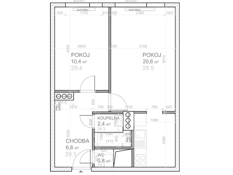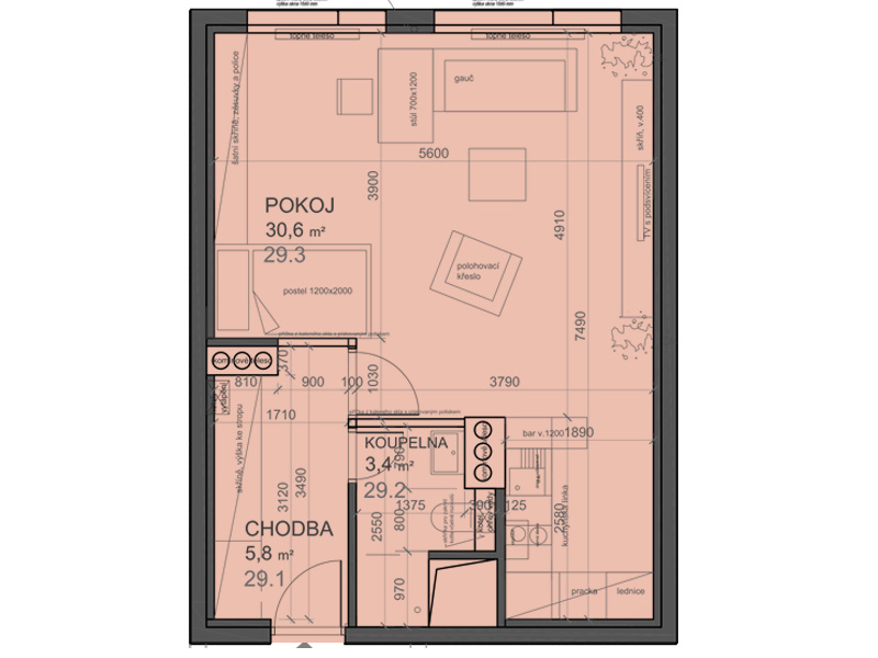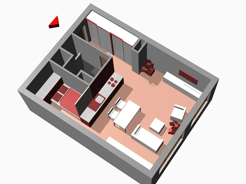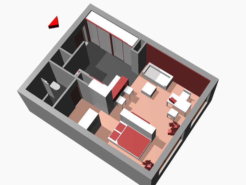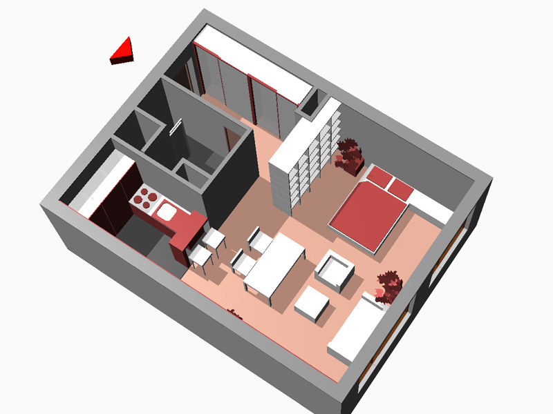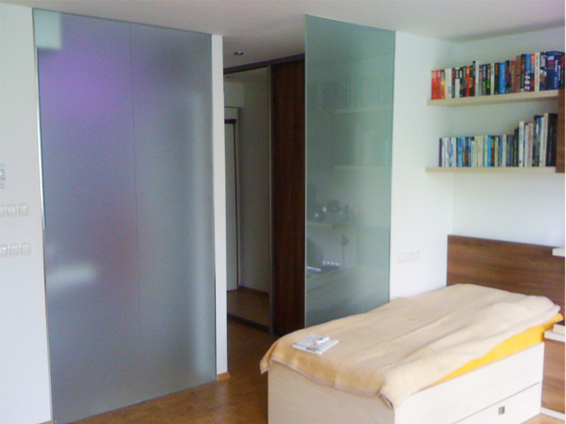 Kompletní rekonstrukce panelového bytu 40m2. Cílem návrhu je vytvořit byt pro jednoho uživatele. Prosvětlení prostor bez oken je realizováno prosklenými příčkami.
