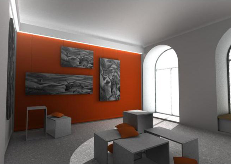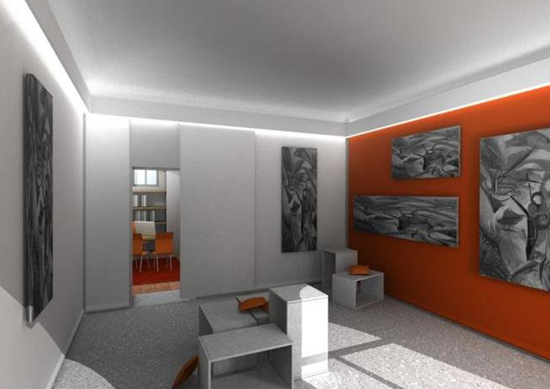 Nízkorozpočtová rekonstrukce interieru pro realizaci svépomocí. Byly upraveny povrchy v hlavní místnosti, navržen systém pro zavěšení obrazů a osvětlovacích těles. Papírové kostky jako mobiliář, posuvný obraz jako vstup do zázemí.
