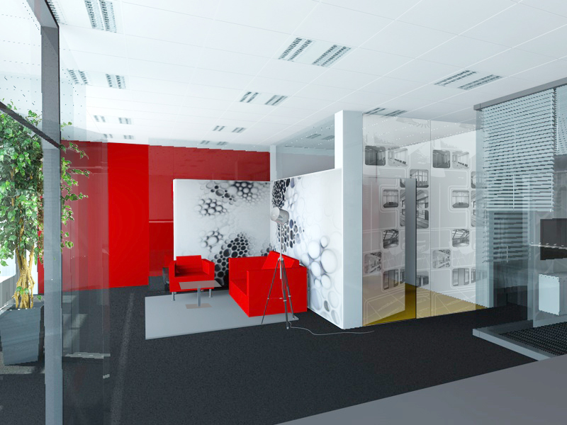Kanceláře pro výrobce montovaných příček v Praze. Brand design a prezentace výrobků, projekt interiéru.