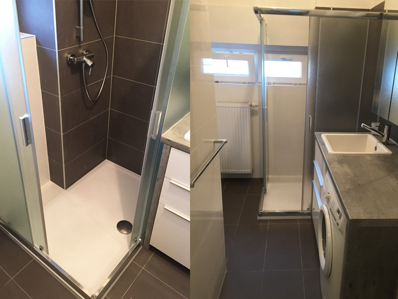 Rekonstrukce koupelny. Umyvadlo integrováno do kuchyňské linky, aby vznikl dostatečný úložný a manipulační prostor.
