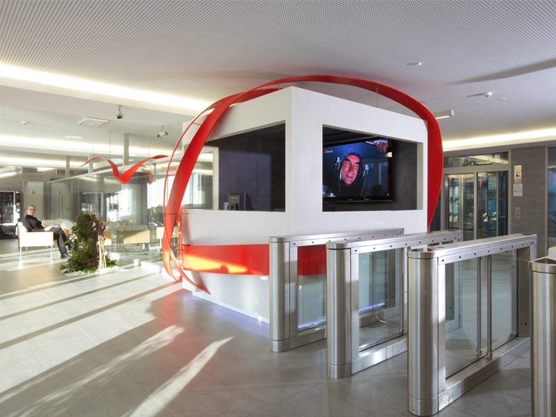 Uzavřená recepce s motivem reminiscence na logo společnosti. Ocelová konstrukce, corian, Hi-max, čalouněný interiér. Včetně technologií a osazení do prostoru vstupní haly.