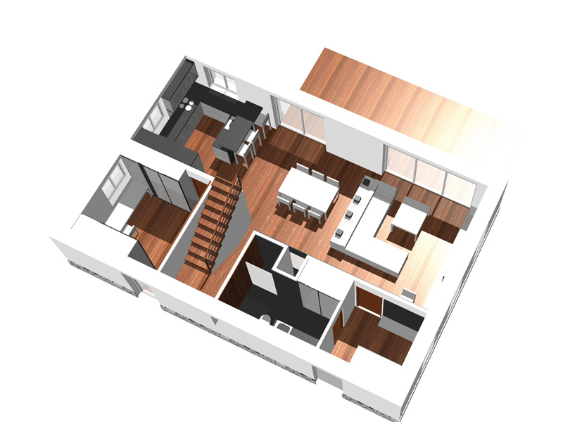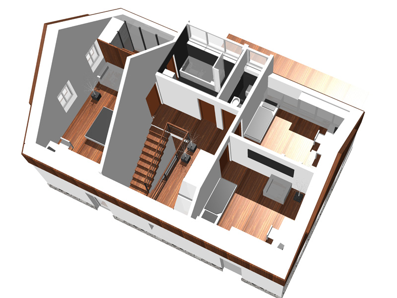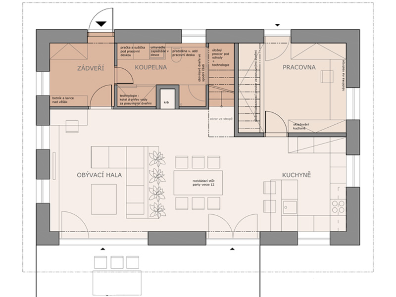 Vstup do objektu je ze severní strany, aby jižní strana disponující výhledy mohla být plně využita pro obývací halu a terasu. Z prostorného zádveří je vstup do technické koupelny, kde se současně nacházejí technologie objektu. Přímo naproti vstupu procházíme do nejprostornější místnosti objektu – obývací hala s kuchyní. Hala disponuje všemi výhledy, které pozemek poskytuje a vstupem na terasu. Hlavní vstup na terasu se nachází mezi kuchyňským a obývacím prostorem. Svoji polohou naproti schodišti tvoří hlavní komunikační uzel objektu. Je zde vstup i do skladovací místnosti, která do budoucna může sloužit jako ložnice. Nyní je plánována jako sklad/dílna neboť objekt nedisponuje skladovací garáží. Tento faktor je současně podpořen venkovním přístupem do místnosti.
