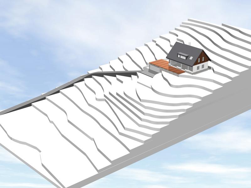 Pozemek je výrazně svažitý. Aby byly zásahy do stávající dynamické krajiny takřka neznatelné, bude se RD nacházet na jediné téměř rovinné části pozemku.