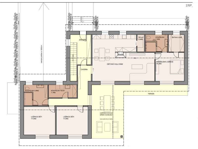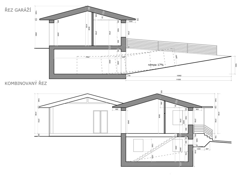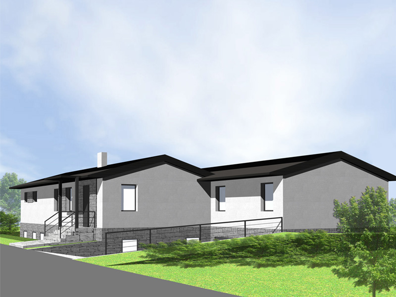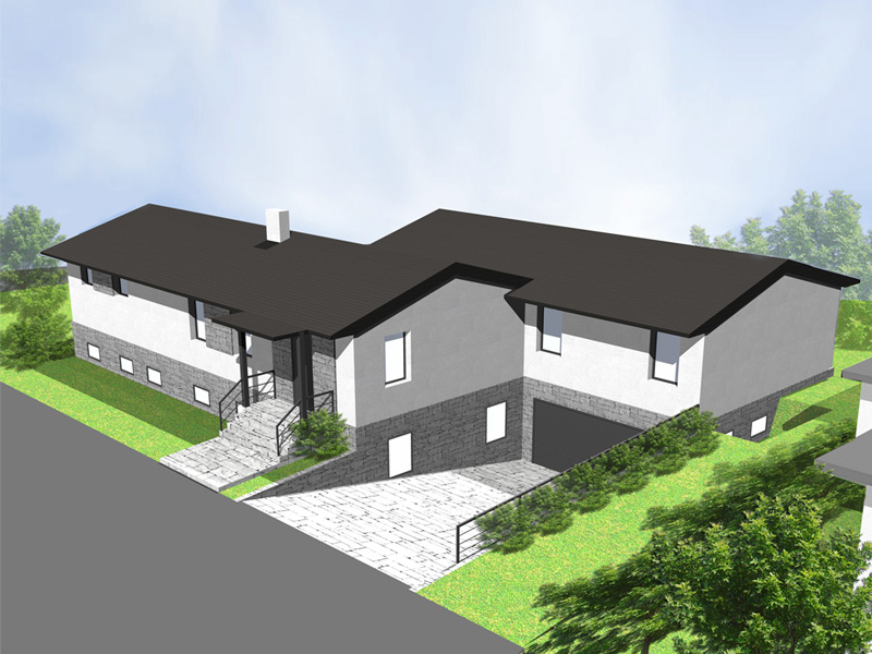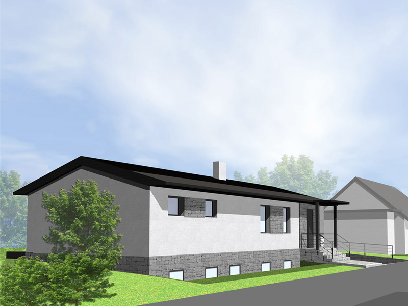 Rodinný dům je navržen jako bungalov s otevřeným krovem. V 1pp se nachází rozsáhlé skladovací prostory a garáž pro tři auta. Objekt je půdorysně rozdělen do dvou vzájemně posunutých částí, aby vznikl dostatek místa pro vjezdovou rampu a současně zůstala zachována co největší plocha zahrady za domem, kde v zákoutí vzniká krytý prostor pro zastřešenou terasu. Dům je takto umístěn i s ohledem na sklon terénu. U ulice je terén níž, takže vjezdová rampa může být kratší a sklepní prostory zde mohou mít okna.