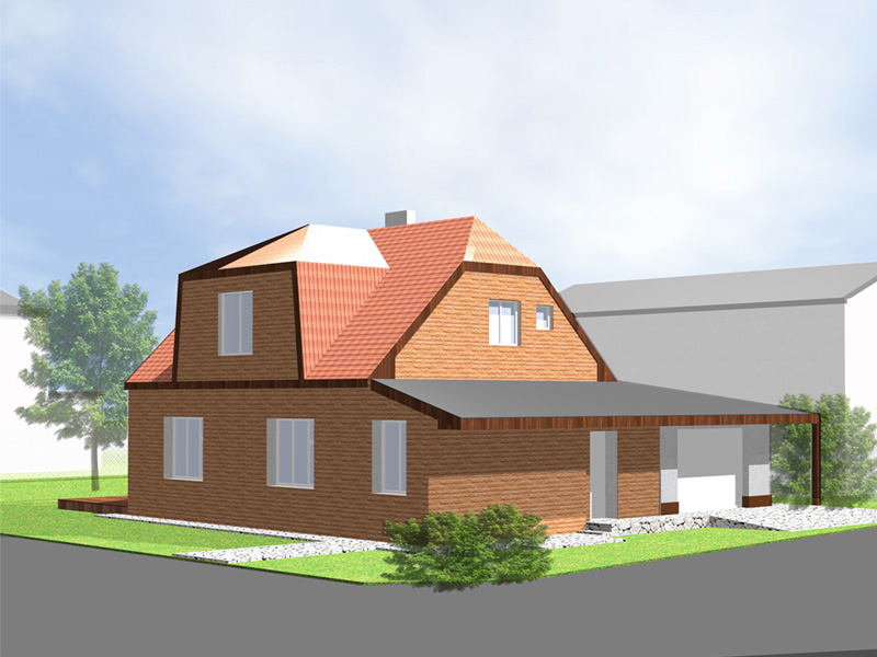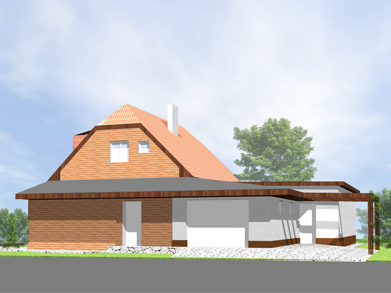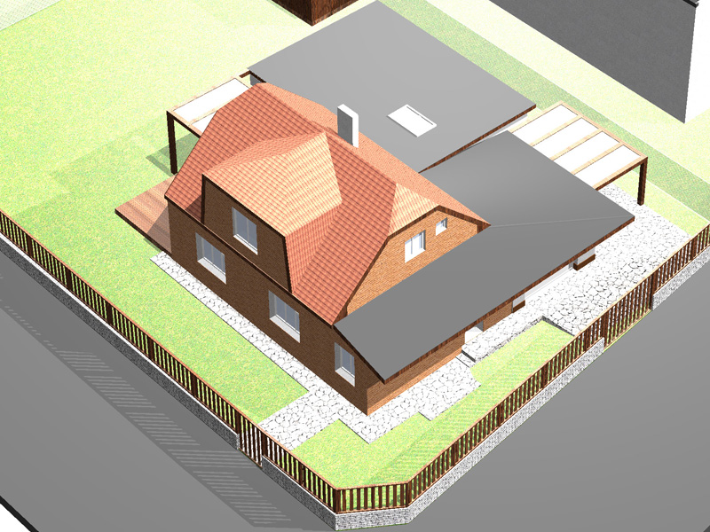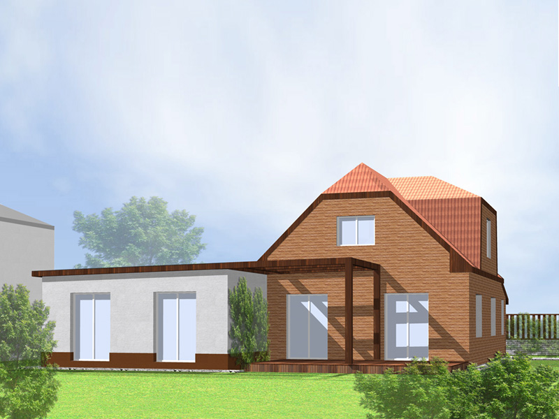 Návrh je koncipován tak, aby co nejméně zasáhl do vizuálu stávajícího objektu. Nová přístavba bude do ulice výškově korespondovat se stávající. To se týká části garáže orientované do ulice. Obytná část je orientována do zahrady a disponuje vyšší světlou výškou 2,7m, stejně jako 1np původního objektu. Aby nebyla zbytečně vysoká, bude mít plochou střechu. Architektonickým záměrem provázanosti s původním objektem je protažená pergola. Celkově tak podtrhuje společný detail všech částí objektu – dřevěné orámování, které bude v rámci rekonstrukce barevně sjednoceno. Vysunutí přístavby do zahrady současně zajišťuje závětří na terase.