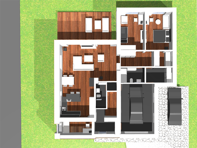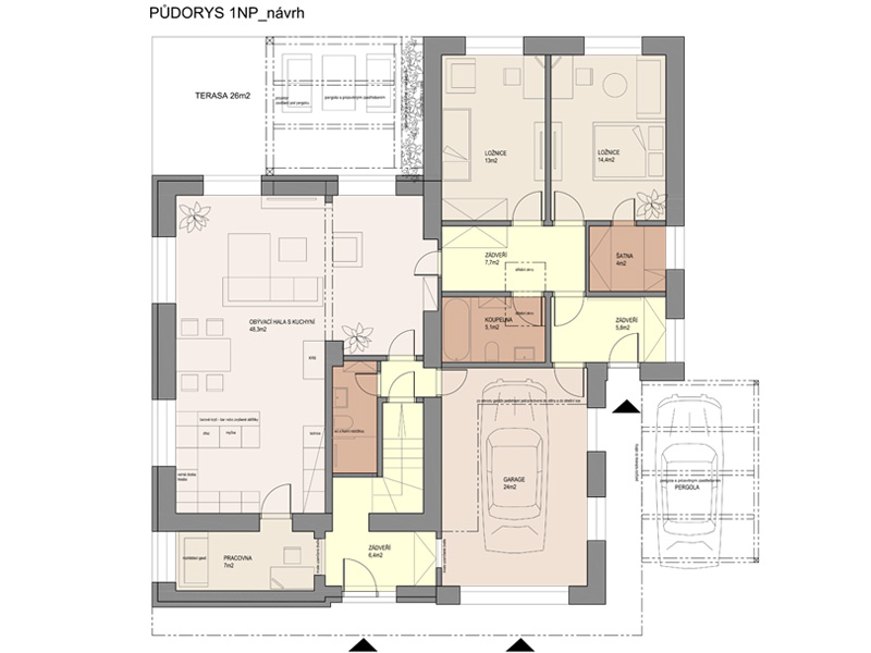 Nový vstup do objektu je v části přístavby vedle garáže a venkovního parkovacího stání pod pergolou. Ze zádveří je přístup do garáže. Dále do chodby odkud je přístup do koupelny, obývací haly a do dvou ložnic orientovaných na západ do zahrady. Jedna ložnice disponuje šatnou.