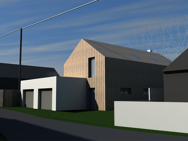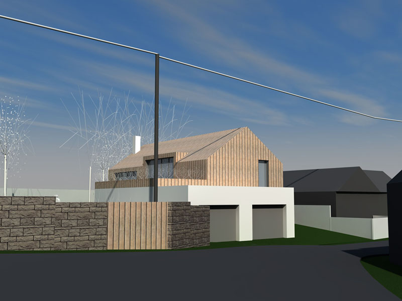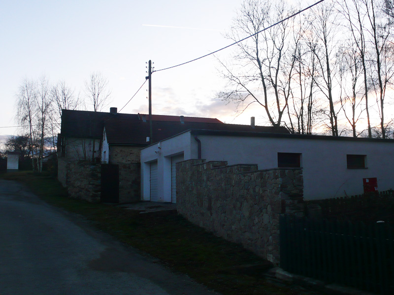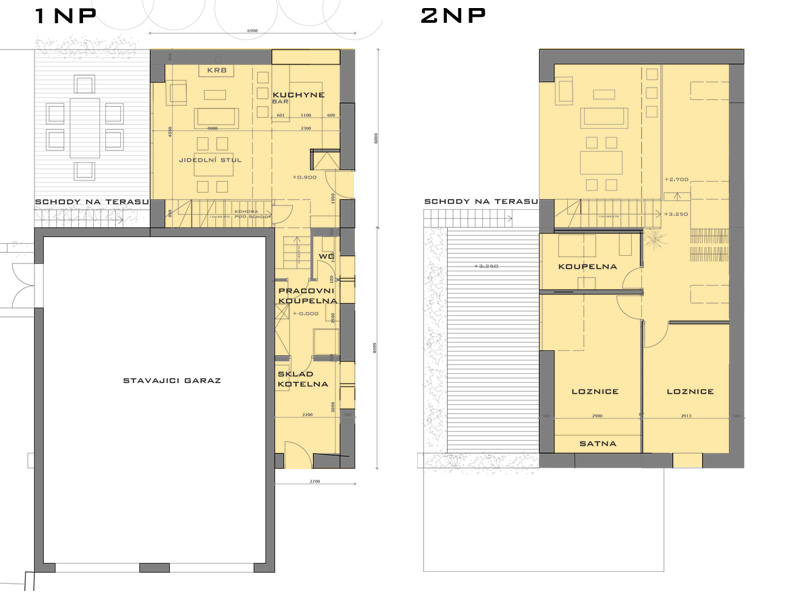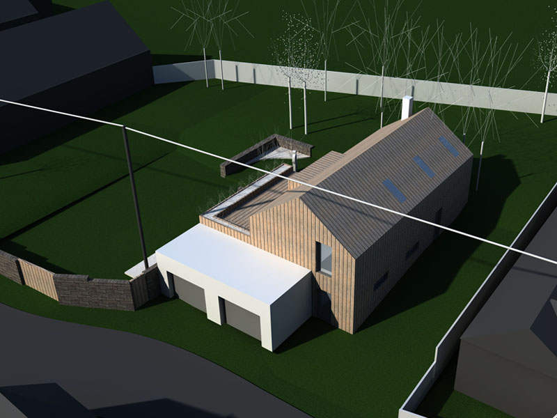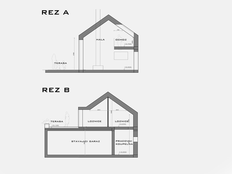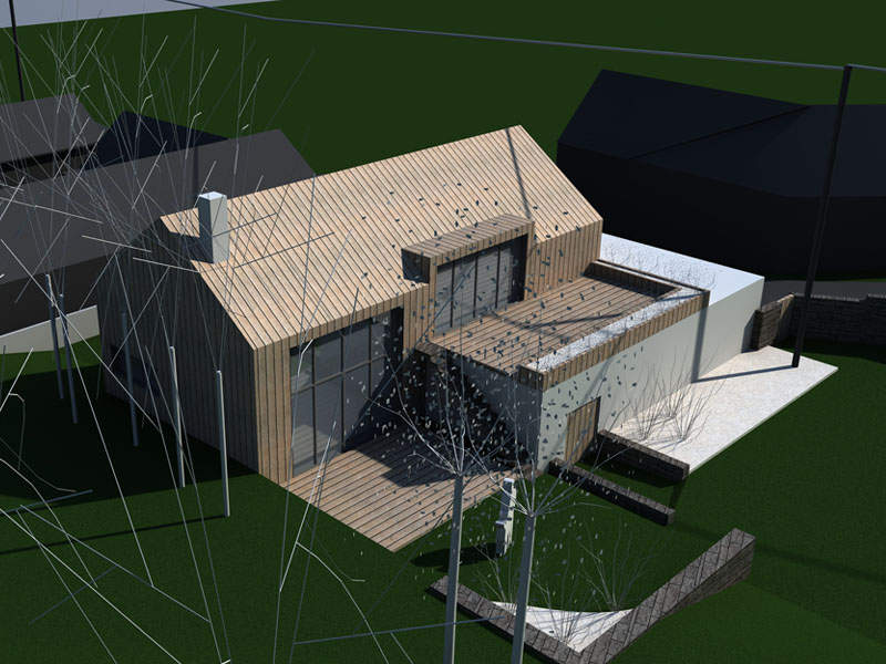 Rekreační domek jako přístavba ke stávající garáži se zahradou a terasami. Nestandardní řešení odvodnění a stínění střechy dřevěnou konstrukcí.