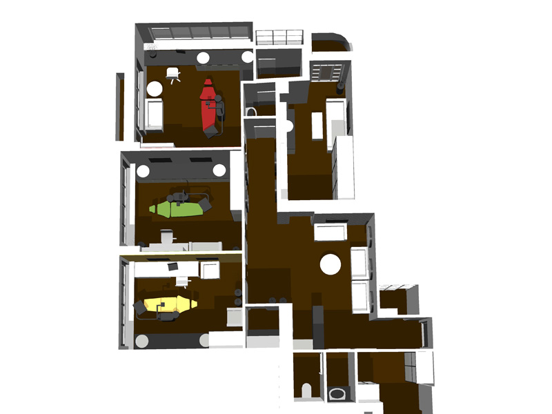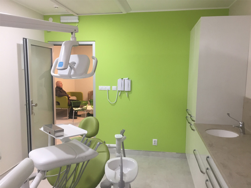 Ve stávající bytové jednotce vniknou 3 samostatně pronajímatelné zubní ordinace přístupné z čekárny. Pro personál je zde dayroom s kuchyňkou, šatními skříněmi a gaučem s možností přespání. Dále pak WC s umyvadlem, skrze které je přístup do technologické místnosti. Technologická místnost je umístěna na okraji dispozice z důvodu hlučnosti kompresoru a možnosti přímého větrání trvale pootevřeným oknem. Dále je zde samostatná místnost pro autoklav a samostatná místnost pro úklid a odpad, které jsou obě přístupné z čekárny.