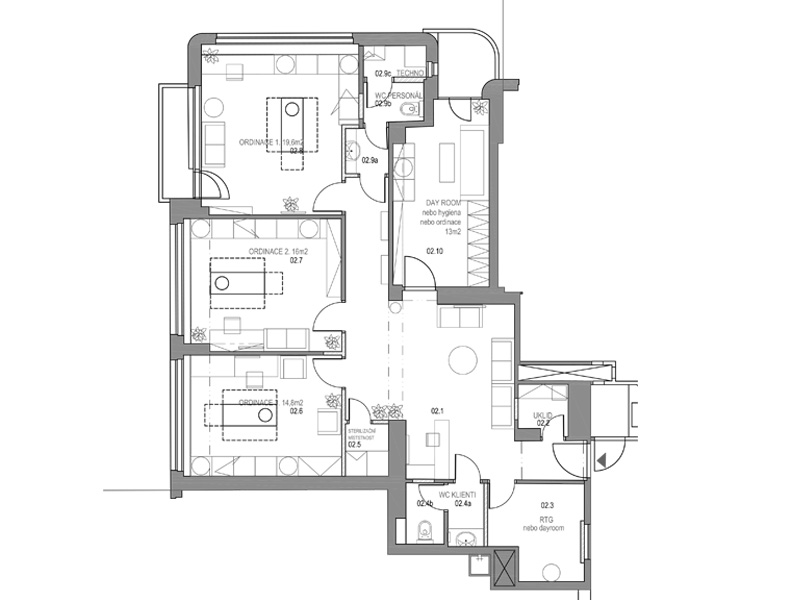 Poblíž vstupu je místnost pro RTG, která je přístupna skrze samostatnou předsíň, která současně slouží jako úložný prostor. (V budoucnu možná jako šatna, pokud by se z navrhované místnosti dayroom stal obchod, nebo provoz zubní hygieny pro který zde bude zbudována stavební příprava pro dentistické křeslo.) Dále je zde psychologický faktor pro existenci předsíně, aby se klienti v čekárně necítili potenciálně ohroženi provozem RTG. (Pozn: malé RTG je dále přítomno v každé samostatné ordinaci).